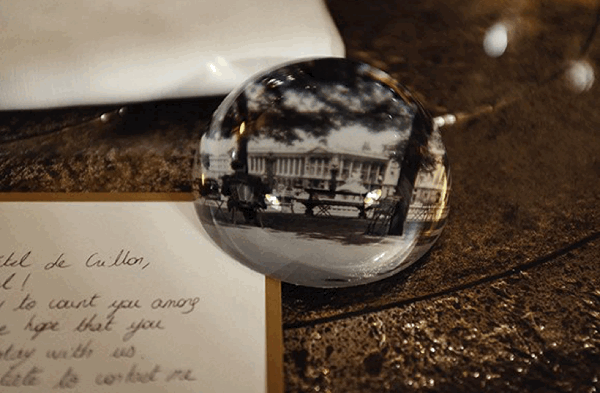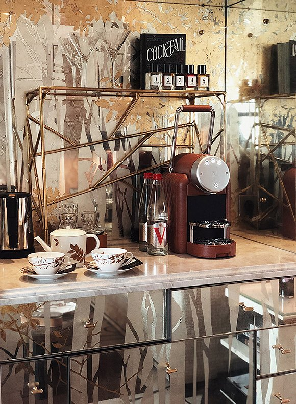 客厅有长沙发搭配单人沙发,用的是灰色和蓝色的色调。Minibar 有巴黎瑰丽定制的皮棕色 Nespresso 胶囊咖啡机、“米其林标准”品牌 Christofle 的餐具茶具、还有瑰丽著名的调酒手册。工作台区域,欢迎果盘里有四个橘子,略显简单,文具盒上放着法式古董车的模型,盒子里有常规的明信片、信封信纸和旋杆银笔,还有一个溜溜球供你玩耍。沙发桌前则摆着香槟和欢迎蛋糕,让之前欢迎果盘的寡淡显得无法苛责什么。玻璃纸镇嵌入了克利翁先前的黑白相片,压着手写的欢迎信。还有一大本卓别林图册配有放大镜,算是古典居家的装饰品了。