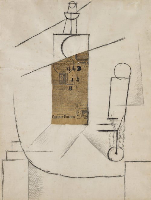 当1912年的时候,毕加索创作了静物抽象画《桌上的瓶和玻璃杯》, 他用一张报纸拼贴,当做瓶子的主体,报纸上的酒水广告颇有写实的智慧——从艺术史的角度来说,他和他的同伴立体派艺术家乔治·布拉克(Georges Braque)并非“发明”了拼贴。他们只是在做维多利亚时代的人做过的事情。难怪现代拼贴作品还是如此频繁地以维多利亚时代为主题。马克斯·恩斯特(Max Ernst)为视觉小说创作的原始拼版,以及保尔·艾吕雅(Paul Eluard)描绘的一头大象在巴黎一家咖啡馆里横冲直撞的画面,都与这古老的早期作品非常契合,因为这些超现实主义杰作是基于19世纪的旧出版物创作得来的。彼得·布莱克(Peter Blake)1962年创作的《玩具店》(The Toy Shop)延续了这一传统,这是一本关于童年记忆的杰作。
