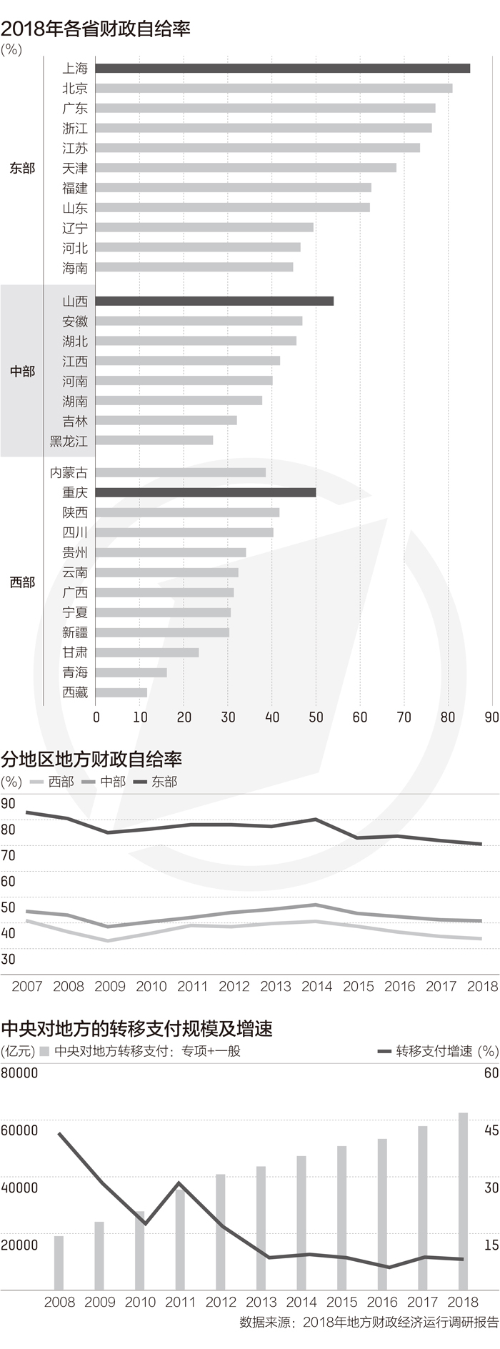 转移支付在均衡地方财力方面的效果显著,但同时地方对转移支付的依赖度在上升,越是经济发展弱、压力大的地区,转移支付的依赖度越会增高。
