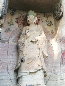 释迦牟尼佛,高6米。其面相丰圆,眉间白毫相,螺发高肉髻,双耳垂肩,嘴角含笑而不启齿如同《诗经》里所形容:“巧笑倩兮,美目盼兮。”让我不禁想到伟大雕塑家罗丹在描述另一尊杰出雕塑《梅迪奇的维纳斯像》时所说:“抚摸这座像的时候,几乎觉得它是温暖的。”其左手仰掌于胸腹前,右手施说法印,大拇指与食指中夹一毕波罗花果。其拈花微笑之状,令人想起龙门石窟奉先寺石刻主尊像大卢舍那佛的微笑,而且似乎更生动。如果说大卢舍那佛表现的是“大唐的微笑”,那么可以说眼前的释迦牟尼佛表达的却是“大宋的微笑”。