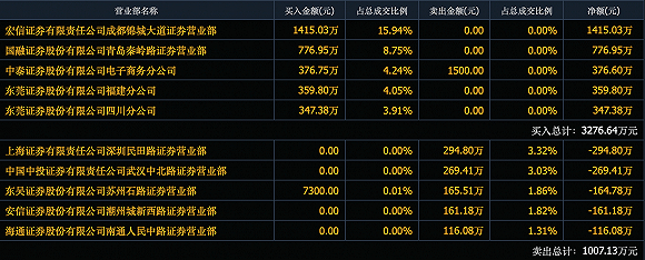 其中,宏信证券成都锦城大道营业部、国荣证券青岛秦岭路营业部、东莞证券福建分公司、东莞证券四川分公司分列1、2、4、5位,买入金额分别为1415.03万元、776.95万元、359.8万元以及347.38万元。其中国荣证券青岛秦岭路营业部为成都系知名游资,上述四家均为四川资金。