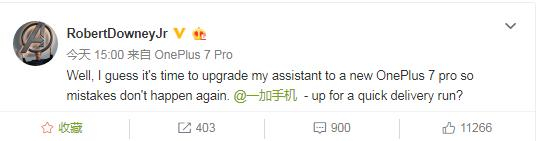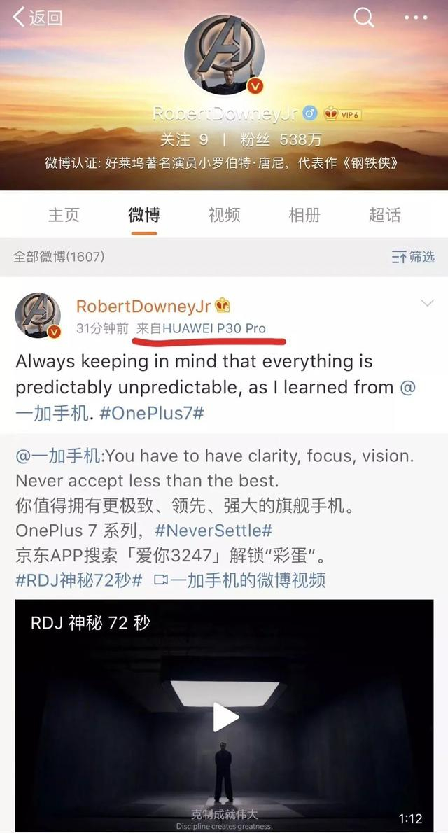 一加代言人小罗伯特唐尼竟用华为P30 Pro发微博,当然是笑着原谅他
