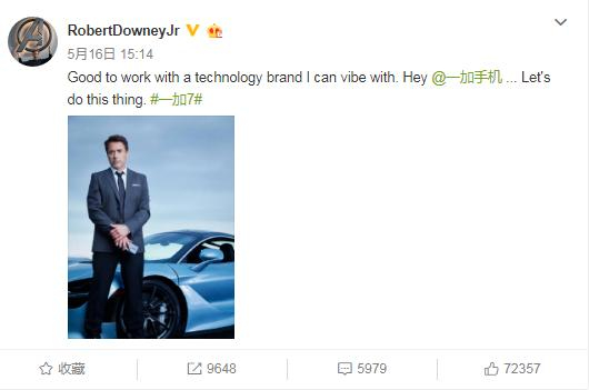 今年,5月一加发布一加手机7时宣布钢铁侠扮演者小罗伯特·唐尼成为一加7 Pro的品牌推广大使。他在微博中也表示,“很高兴与科技品牌一加合作。”在微博的配图中,小罗伯特·唐尼手持一加7 Pro,身后的车也是之前与一加合作过的迈凯伦跑车。
