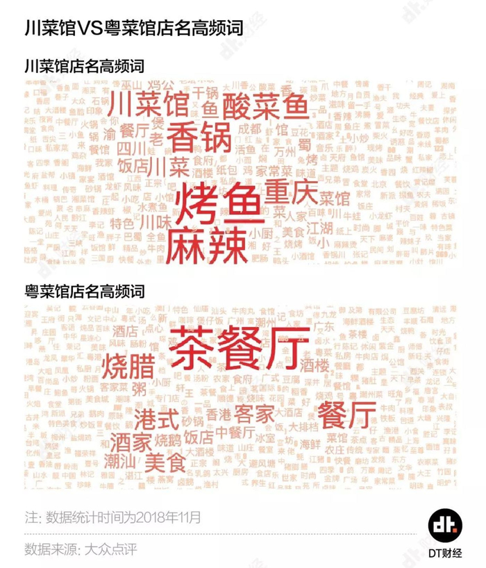 根据DT君从大众点评上获取的全国餐馆数据来看,川菜馆数量是粤菜的两倍还不止。