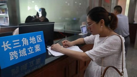 8月2日上午10时40分许,黄霞律师来到上海市徐汇区人民法院(以下简称上海徐汇法院),她代理的是一起劳动合同纠纷案。不同的是,这起案件的管辖法院是江苏省南京市六合法院(以下简称江苏六合法院)。引导台工作人员在了解其诉求后,将其引导到了跨域立案窗口。窗口前摆放着“长三角‘一网通办’跨域立案”的标识。
