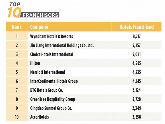 特许经营酒店公司的Top 10榜单分别有:温德姆、锦江、Choice Hotels、希尔顿、万豪、洲际、首旅如家、格林、尚美、雅高。