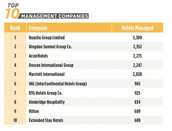 酒店管理公司Top 10榜单上依次是:华住、尚美、雅高、东呈、万豪、洲际、首旅如家、Aimbridge、希尔顿、Extended Stay Hotels。