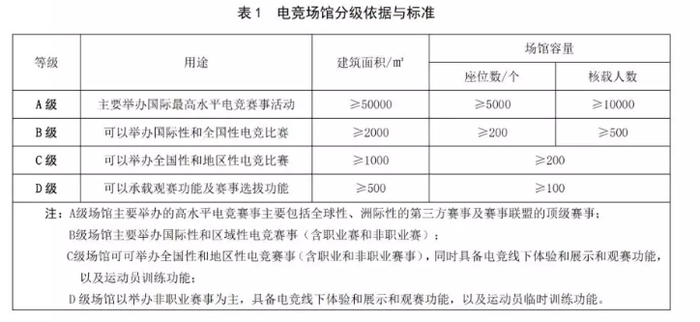上海两项电子竞技团体标准出台正是要解决这些难题。从规范来看,上海市电竞场馆根据场馆内可举办电竞赛事的级别、建设规模以及功能等指标,分为A、B、C、D四级,不同级别场馆的建筑面积、座位数量、核载人数也都做出了具体规定。