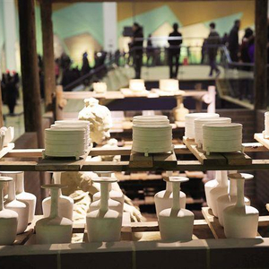 ■2017年1月16日,在河南省平顶山市宝丰县大营镇清凉寺村,人们在参观宝丰县清凉寺汝官窑遗址展示馆内放置的汝窑瓷器素胎。