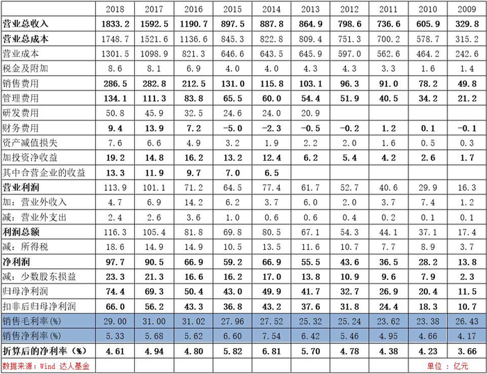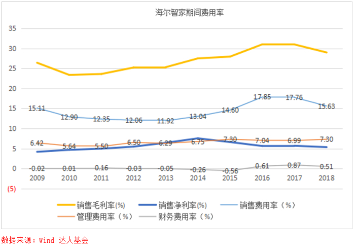 公司十年以来业绩优异,营业收入与扣非归母净利润均有5倍以上的增幅,2015年受宏观经济影响,全行业不景气,海尔智家也出现了双降。通用电器白电业务在2016年并表,16与17年公司业绩增长明显,2018年扣除并表影响,公司依旧表现亮眼。由于海尔摊子铺得大,联营企业贡献的投收益占净利润的比例远超格力、美的,而这些联营企业的收入并没有纳入上市公司,在拿公司净利率水平与格力、美的进行对比的时候,必须要扣除这一影响,另外两家巨头也享受政府补贴,期间也产生投资收益,公平起见仅用公司净利润减去合营企业的投资收益再比上收入来表示海尔智家折算后的净利率,那么我们可以看出近三年海尔换算下来的净利率水平都在5%以下,而格力、美的2018年净利率分别为13.3%、8.3%。同期海尔、格力、美的的毛利率分别为30.2%、29.0%、27.5%,海尔并不弱的毛利率产生了三巨头中显著最低的净利率,这要从期间费用上找原因。