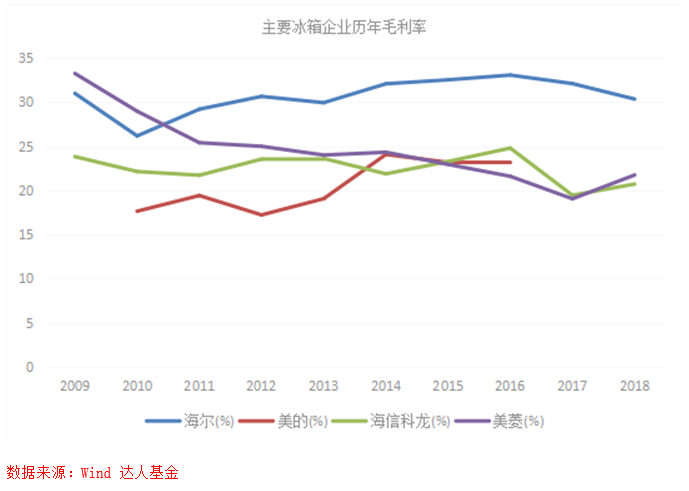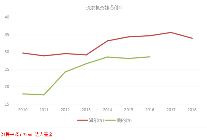 海尔智家在洗衣机方面也表现优秀,国内线下市场零售额份额提升3.7个百分点,达到33.57%;国内线上市场份额提升6.5个百分点,达到34.4%。卡萨帝在中国万元以上冰洗家电市场份额达到42.7%,提升7.7个百分点。在美的集团先后收购万事达与小天鹅后,洗衣机行业进入实质上的双寡头垄断阶段,显而易见美的这几年发展的比海尔更快,但海尔的市占率也还是在上升的。毛利率方面,美的的数据只披露到2016年,但可以看出海尔洗衣机的毛利率一直高于美的。