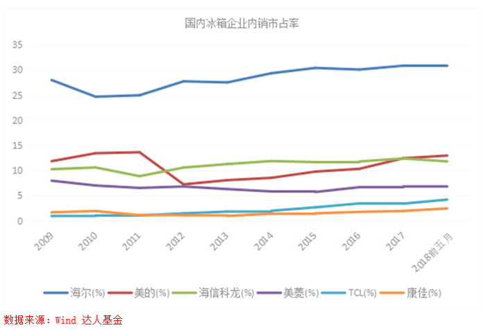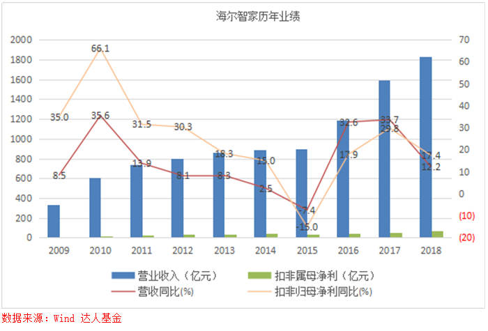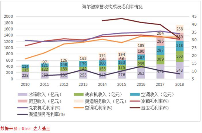 根据世界权威市场调查机构欧睿国际数据显示:2018年海尔全球大型家用电器品牌零售量第一,第10次蝉联全球第一,海尔冰箱、海尔洗衣机继续蝉联全球第一。国内市场,海尔全线产品份额保持2017年以来的全面提升态势,根据中怡康月度零售监测报告统计2018年海尔冰箱、洗衣机、空调、热水器、烟机、灶具线下市场零售份额分别提升3.52、3.68、0.43、1.16、0.99、0.66个百分点,海尔冰箱、洗衣机继续保持行业第一并扩大领先优势。美国市场,在家电行业低迷的不利环境下,收购的通用白电通过人单合一模式的有效复制,收入增长13%,市场份额提升超过3个百分点,成为美国市场增长最快的家电企业。以上的全部文字内容均来源于公司2018年年报内容,曾经极度辉煌的海尔在过去五年没有格力和美的跑得快,被投资者认为战略层面上出现了错误,但看其2018年年报明显感受到海尔在走上坡路,全球化和打造高端品牌策略都颇有成效,所以有必要对公司进行更深入了解。