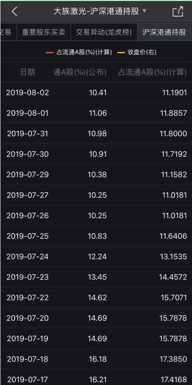 Wind数据显示,大族激光的沪深港通持股比例占流通股市值,从5月初的约18.6%降至目前的11%左右。第一财经记者从几家外资机构了解到,其内部从去年下半年开始就在讨论是否要继续持有大族激光。外资一直将大族激光看作中国制造转型升级的“头牌”,但2018年下半年开始,消费电子需求低迷、行业新进者引发价格战。而外资在调研及与公司管理层的接触中也发现一些治理问题,股权质押率高企是隐患之一。