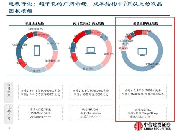 据统计,我国目前液晶电视行业的市场规模在1500亿元左右,年均销量为4500~5000万台。从行业成本构成看,液晶面板占比达70%以上。而在液晶面板中,LED背光模组成本占比最高,从成本占比可看出LED模组处在液晶面板重要位置。随着智慧屏、智慧电视的相继推出,未来率先受益的领域或先是LED领域。