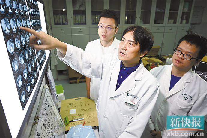 ■广东省第二人民医院影像科主任、主任医师江桂华(中)在阅片
