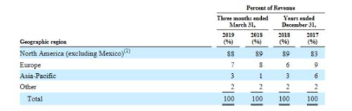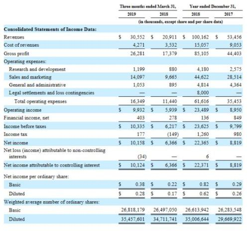 财务数据来看,2019年第一季度营业收入增长至3055万美金,与去年同期的2091万美金相比增长了46%,其中北美市场营收增长45%,欧洲市场增长27%。净利润增长至1015万美金,比去年同期的637万美金增长了59%。2018财年营收超1亿美金。