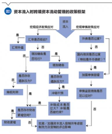 综上所述,跨境资本流动管理是一个庞大的政策框架体系,包含了不同的政策工具和操作原则。图3为IMF提出的应对资本流入时跨境资本流动管理的政策框架(资本流出时反向操纵同样适用)。