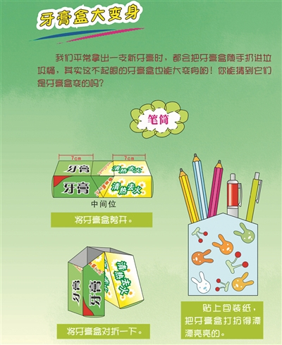 平时拿出一支新牙膏时,大家都会把牙膏盒随手扔进垃圾桶,其实这不起眼的牙膏盒也可以大变身呢!只需将牙膏盒从中间位剪开,将其对折一下,再贴上包装纸,牙膏盒就能成为打扮得漂漂亮亮的笔筒了。
