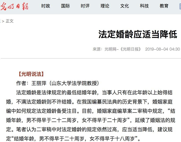 8月4日,山东大学法学院教授王丽萍在《光明日报》发表文章称,在我国当前发展情形下,男22周岁、女20周岁的法定婚龄已不适应我国国情,应当适当降低,建议规定“结婚年龄,男不得早于20周岁,女不得早于18周岁”。