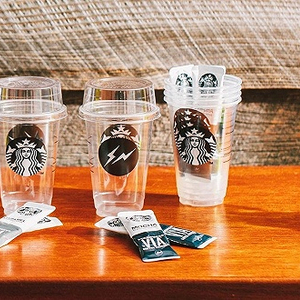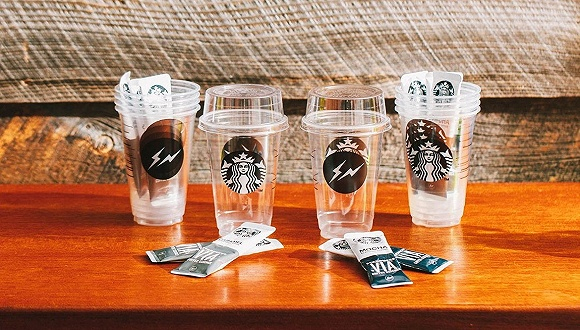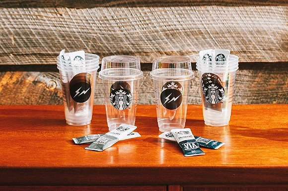 fragment的此次联名配合着星巴克全新推出的两款即饮咖啡一同发售。两款新品分别为摩卡和焦糖风味,除了常规的热饮之外,在凉水中也能溶解成为一杯沁爽的夏日冰饮。此外,藤原浩还为实体店销售的杯装咖啡设计新的外观,fragment炫酷的闪电logo被绘于其上,走在街上想必也能吸引不少目光。