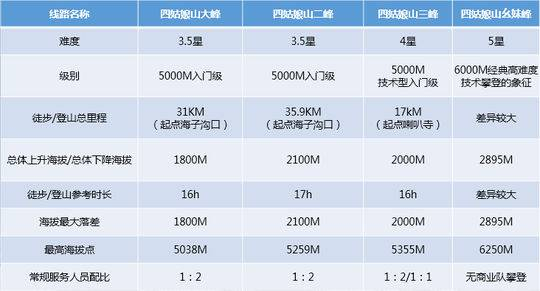 根据这份登山星级标准,四姑娘山四座山峰的星级评定分别为大峰3.5星,二峰3.5星,三峰4星,幺妹峰5星。其中大峰/二峰都是5000米以上的入门级别登山线路,徒步总里程在30公里+,海拔落差在2000米上下,无需其他辅助装备和技术,通过徒步即可到达顶峰的山峰。且目前线路成熟,从山脚往返大本营之间均有马匹可以载重,大本营设施也较为完善。 是高海拔登山新手绝佳的试炼场。携程平台上,四姑娘山的产品已有几十条,除了冲顶线路,还有不少适合亲子出行的轻徒步线路。