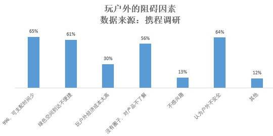 是什么阻碍了中国人参与户外运动?携程针对用户的一项户外调研显示:可支配时间问题(65%)、绿色空间到达不便捷(61%)、认为户外不安全(64%)、没有圈子、对户外产品不了解(56%)被认为是影响户外意愿的四大重要因素。
