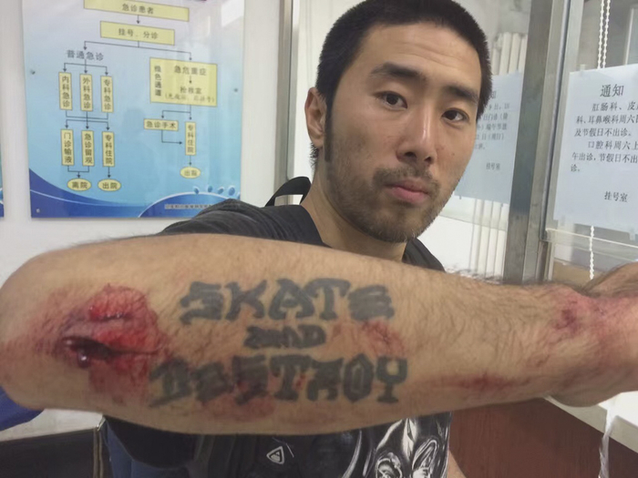他想了一会儿,非常认真地说:“不滑板我可能真的废掉了。我小时候,原来是不打架的,但是被人欺负得太多太多,我也开始打他们。我们越打越狂,被老师骂,还找外校学生打老师。也有外校的来堵我们校门口,大家都不敢出去。第二天互相发消息,都去五金店买水果刀西瓜刀放包里去学校。然后中午全部被逮了。我还记得我朋友,他爸来接他,到班上一拳直接干地上,从三楼打到一楼,再也没见他到学校。说了你们都不信,我们那里就是这么乱。学校门口有事没事一堆人站着,你看那个人爽吗?不爽就打,打完就走。我那时候真是被欺负太多了,已经怕了,才会有报复心,然后进了这个环境,也想欺负别人,慢慢也会变坏。还好那时我接触到滑板了,我就直接逃学,每天都滑板。”
