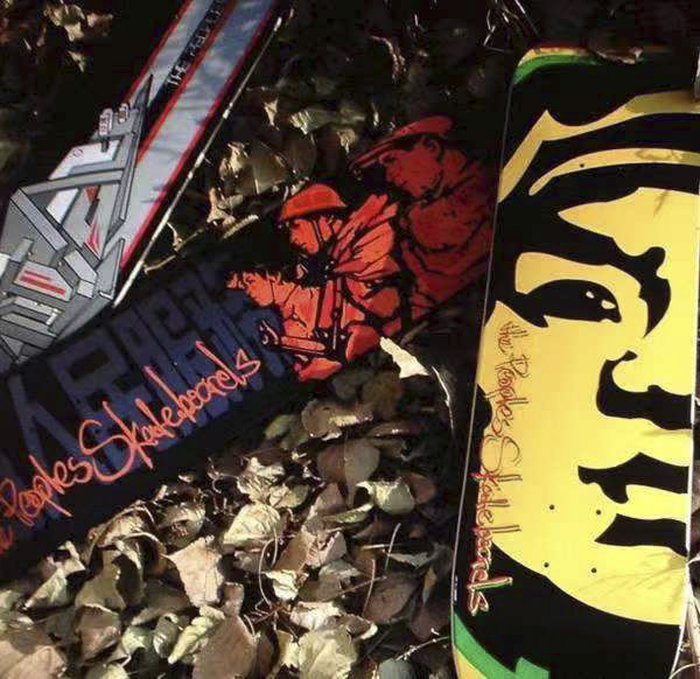 李球球设计产品,辨识度极高。他融入中国本土元素,又呈现出强悍、反叛的街头气质,比如汉字“滑板黑社会”或是抱拳动作的板面图案。经典作品之一,是用文革版画风格绘制的表情坚毅的工农兵头像,底下写着标语“全世界滑板者联合起来”。