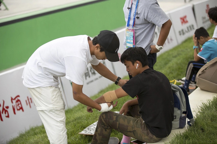 队伍到了比赛地南京,食宿都很差,滑手们一肚子怨气。尚欣宇练习时把仅剩的半颗门牙磕掉了,领队跟他去医院取干净牙,连带着把拍的片子和医院证明都收走了。他带着脚伤撑过预赛,脚更疼了。决赛前,他只能自己找朋友给他介绍的中医药大学医学生做正骨。传说中的队医压根没影。