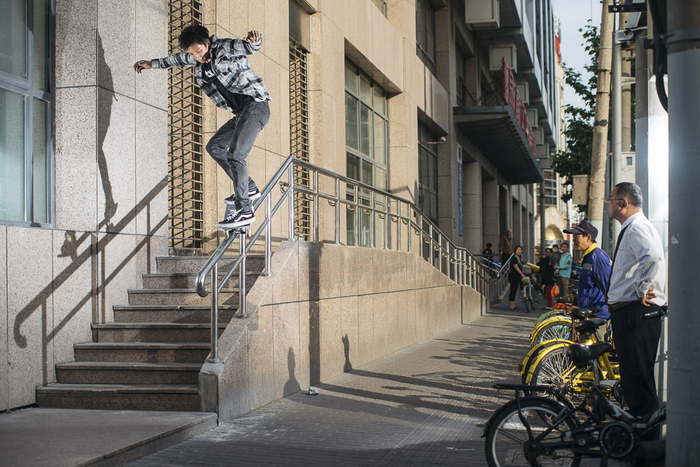 华普超市门口有一段大台阶,是北京滑板的一个据点。在那儿,Raph和李球球看到一个小伙,个儿不高,毛发旺盛,正在跳一个存自行车的三角钢架练习Ollie。钢架大约80公分高,他非常专注地跳过来,又跳过去,旁若无人。
