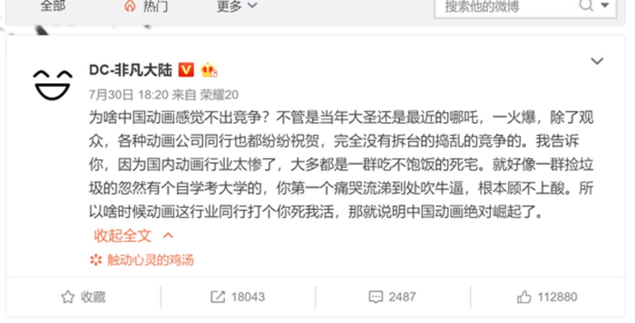 大多“自来水”其实对哪吒的看后repo只是加了滤镜大喊支持国漫的路人式发言。但过分尬吹的背后体现出来的是真正了解关心动漫行业的真路人是极少的,这些年来优秀的动漫作品并不是从大圣到哪吒质的飞跃,这中间量的积累被大家忽略。
