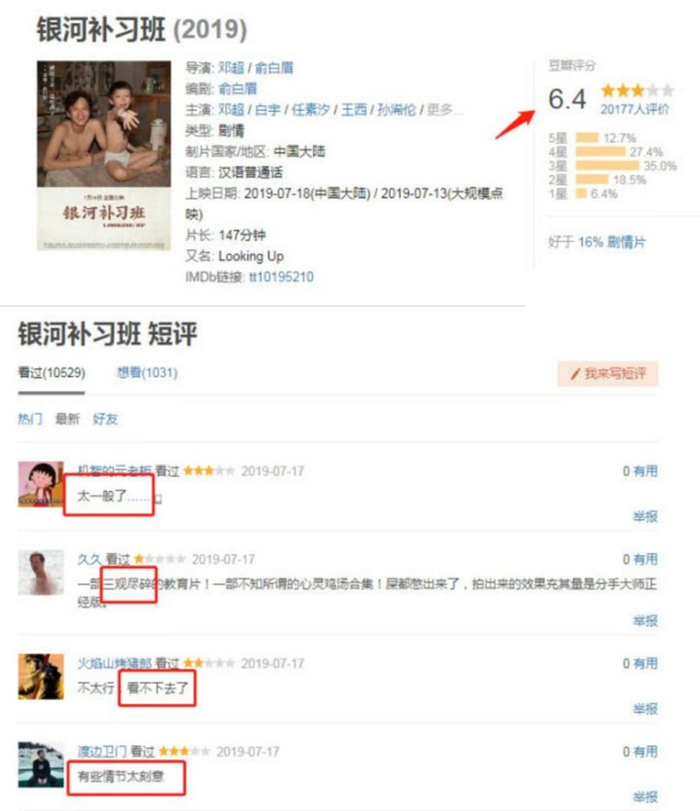本是最有希望凭借提档在逆市中“破风”的《银河补习班》就栽了个大跟头在点映上。其最初点映效果极佳,在200场点映阶段取得了单日票房破70万和高达80%上座率的表现。但人心不足蛇吞象,点映排片场次逐渐增多高达2万余场,在影片正式上映前8小时票房已经破亿,这串看似可喜的数字背后是口碑两极分化,断送了其本来极有可能持续走高的盘路。