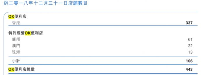 据利亚零售2018年财报显示,截至2018年末,利亚零售旗下OK便利店达到443家,分布于香港、澳门、广州、珠海等地。其中,香港有337家,广州有门店61家,珠海有13家,澳门有32家。