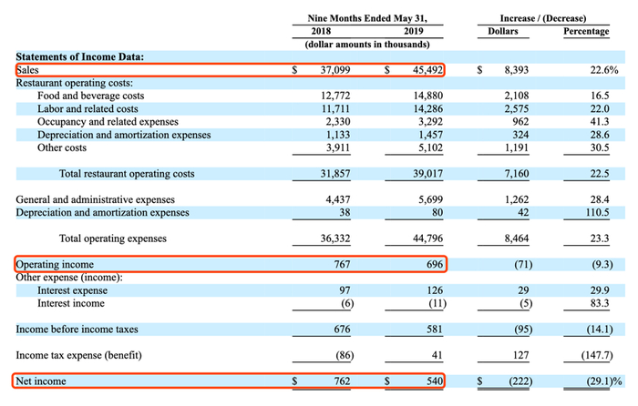 截至2019年5月31日前九个月,库拉寿司的销售额达到4549万美元,同比增长22.6%,但相比于2018财年38.9%的销售增长速度似乎有所放缓,原因是月拉古纳山门店的关闭减少了当期营收。