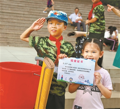 结业典礼上,来自三排3班的刘楚莹还和大家分享了她这几天的军营生活收获。她说:“7天的训练虽然艰苦,但收获很多,不仅掌握了队列训练、军体拳等基本技能,学会了拉歌、呼号、内务整理,还结识了很多小伙伴。”来自中山城区的陈女士表示,这几天来,自己的孩子和其他小朋友一起独立生活,顶着烈日训练,感觉心疼又欣慰,希望他能把在军营学到的东西带到生活中去。