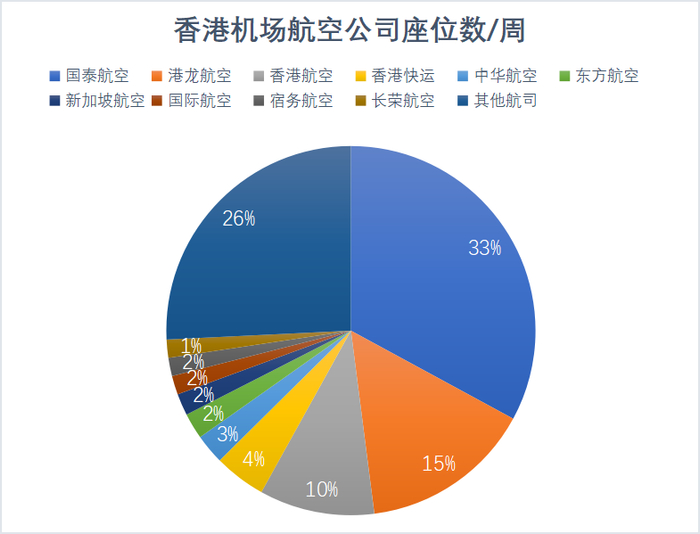 而在航空公司的份额方面,通过IATA数据库8月份的座位数据显示,香港机场的最大基地航司仍然是国泰集团,其旗下的三家公司(国泰、港龙和香港快运)占据了香港机场52%的座位份额。单一基地公司对于机场的发展来说是一把双刃剑,虽然单一公司可以增强机场的枢纽辐射能力,但是由于单一公司市场话语权过大,使得市场竞争不够,造成价格过高市场活力不足,而且航空公司的强势也会造成机场失去在市场增长方向的话语权。