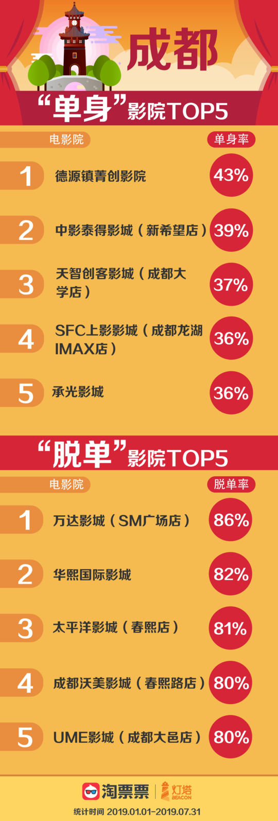 成都“单身”影院TOP5为德源镇菁创影院、中影泰得影城(新希望店)、天智创客影城(成都大学店)、SFC上影影城(成都龙湖IMAX店)、承光影城,成都“脱单”影院TOP5为万达影城(SM广场店)、华熙国际影城、太平洋影城(春熙点)、成都沃美影城(春熙路店)、UME影城(成都大邑店)。