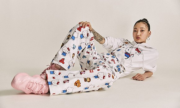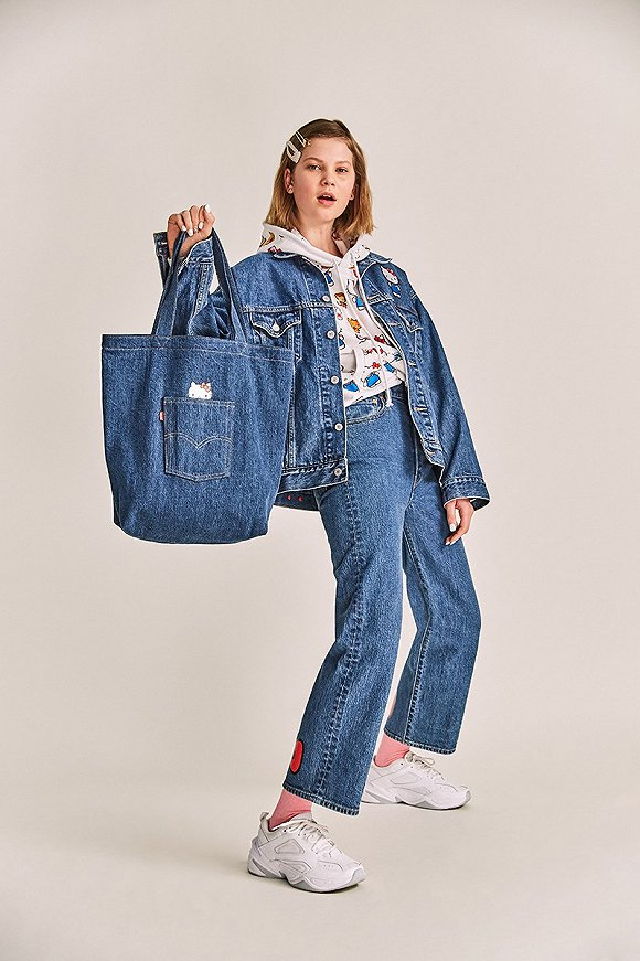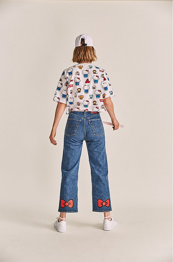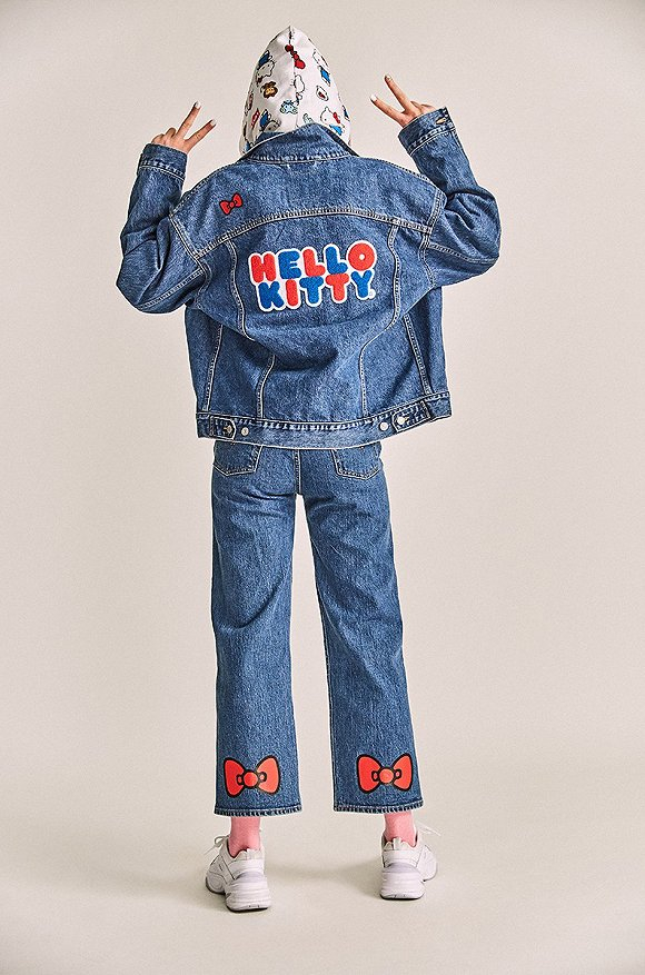 联名系列涵盖卫衣、T恤以及Levi’s招牌的牛仔裤和牛仔外套。T恤和卫衣以黑、白亮色为主调,多种模样的Hello Kitty与Levi’s的logo重叠绘印于其上,具有极高的视觉辨识度。而在牛仔系列中,除了Hello Kitty本人的直接亮相外,她著名的蝴蝶结也以及其它象征性物件则巧妙的亮相于裤脚、袖口等细节处。同时,洒脱的丹宁材质和可爱的Hello Kitty也碰撞出了不一样的独特美感。