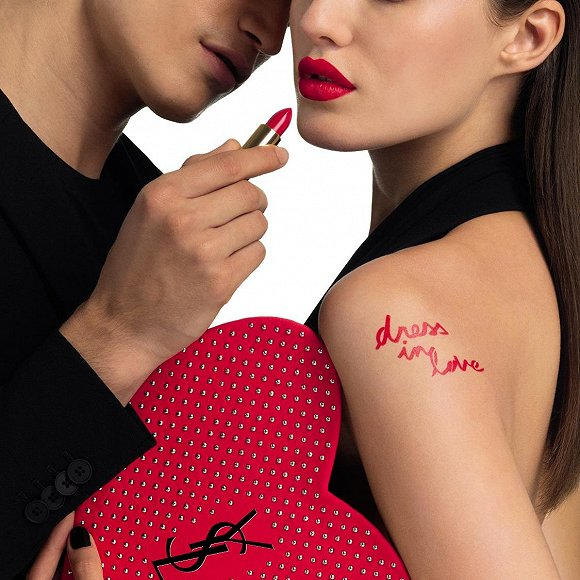 在礼盒中,以往高级定制秀场上的爆裂的摇滚铆钉元素被重新构造,通过涌动的波点装饰出经典方管口红和细管哑光口红代表的爱意,并用红色,橙色,玫红和裸色来代表爱情的多种不同形态。此外,限量版反转巴黎香水也被包含于礼盒中,其瓶身上被绘上了颇具风情的“IN LOVE“字样,向世界宣示对情人的目眩神迷。