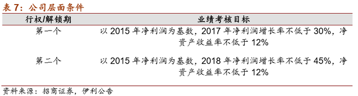 2、首期行权时,伊利股份上一年度扣除非经常性损益后的净利润增长率不低于17%且上一年度主营业务收入增长率不低于20%。