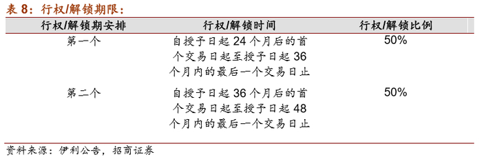 授予数目:5000万股票期权,标的股票占当前伊利股份股票总额的比例为9.681%。