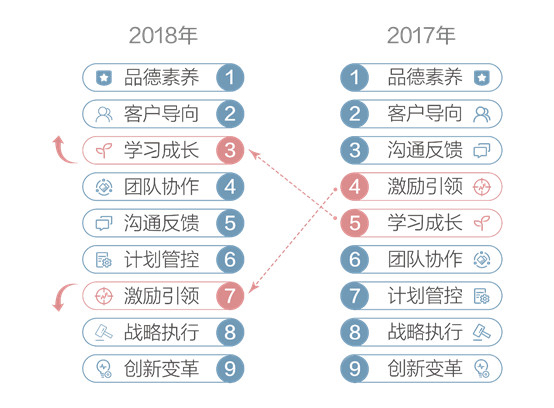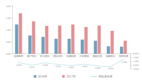 2018年排在最前两位和排在最末两位的维度和2017年完全一致,即第一、第二位为品德素养和客户导向维度,最末两位依旧是上年被我们称作“中基层管理者集体瓶颈”的创新变革和战略执行维度。需要特别关注的是,激励引领维度较上年剧烈下滑,跌入末三位。