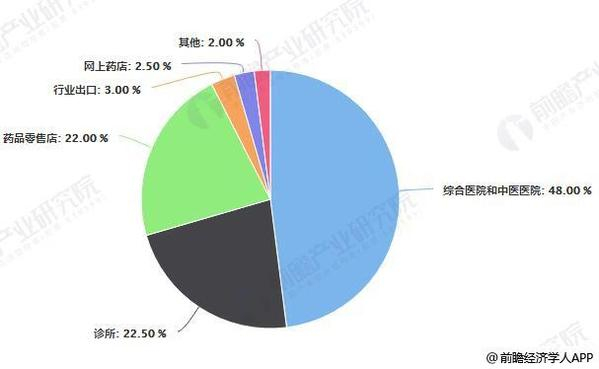 中药饮片的主要消费市场包括医院、诊所、药店、网店等。其中,综合医院和中医医院是中药饮片加工行业产品最大的消费市场,许多消费者倾向于从医院购买药品。随着医保覆盖人群的增长,该消费市场的份额将持续提高。诊所是中药饮片产品的第二大消费市场,在一些没有大型医院的偏远地区,诊所非常受欢迎,占据的比重为22.5%。药品零售店是第三大消费市场,药品零售店相对于其他渠道来说比较方便,随着药品零售店连锁商业化的形成,该细分市场的份额预计将会不断提高。