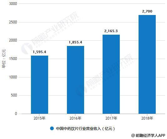 据前瞻产业研究院发布的《中国中药饮片加工行业产销需求与投资预测分析报告》统计数据显示,2015年中国中药饮片行业营业收入已达1595.4亿元,到了2017年中国中药饮片行业营业收入突破2000亿元,达到2165.3亿元,截止至2018年中国中药饮片行业营业收入约为2700亿元,维持近年的较高增长速度。