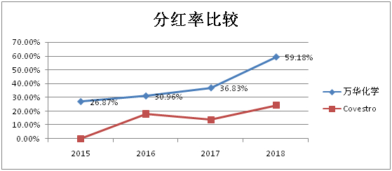 两家公司的负债率比较接近,变化趋势也相同。2018年万华化学的资产负债率为48.97%,第一次负债率低于科思创。两家公司的净资产都在不断增长,万华的净资产增加更加快,2018年万华化学的净资产达到393亿,科思创为422亿,两家公司的净资产已近比较接近。如果按万华化学合并后看,2018年年末的净资产是达到396亿元。7.分红占净利润的比例