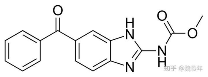 这可不得了,因为多形性胶质母细胞瘤可是相当要命且难治,五年生存率不到10%。这篇论文称,有肿瘤的小鼠得益于这个药物,生存率大大提升。下图是甲苯达唑的结构式: