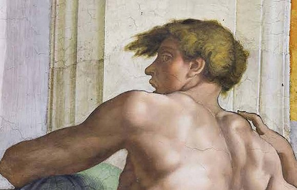 为探究二者惊人的相似性,我写下了《看得见的爱神:文艺复兴时期意大利的艺术、性和古迹》(Eros Visible: Art, Sexuality and Antiquity in Renaissance Italy)一书。此书封面图案来自米开朗基罗在西斯廷教堂所绘的另一幅壁画《创世纪》,图中裸体者摆出引诱的姿势,目光后移看向你,仿佛在问:你看出什么了?我的答案是:在16世纪初至16世纪中叶的反宗教改革运动期间,一场鲜为人知的“色情革命”席卷了意大利。
