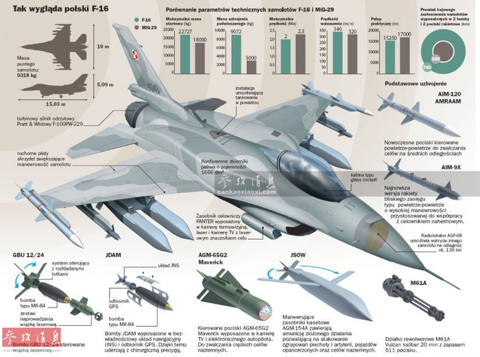 由于波兰采购的这批F-16C/D战机的批次较新,可以使用与美军现役F-16通用的新型制导弹药,如图所示,包括AGM-65反坦克导弹、JDAM卫星制导炸弹、以及射程超过200公里的AGM-154C“联合防区外攻击弹药”(JSOW)卫星制导远程隐身滑翔制导炸弹,还能使用美制新型“狙击手”XR瞄准吊舱(性能是老式瞄准吊舱的四倍,可在夜间精确探测160千米外的静止或移动目标),对俄军靠近边境地区的要害目标具有一定的威慑性。