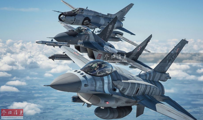 在未来的北约与俄军围绕波罗的海地区的对峙行动中,波兰空军的F-16战机部队还将继续发挥重要作用。图为波兰空军F-16、米格-29战机与苏-22战斗轰炸机组成的联合编队飞行。