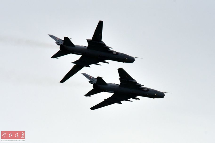 参展的波兰空军苏-22战斗轰炸机进行飞行表演,2架分别展示了其最大和最小变后掠翼状态。